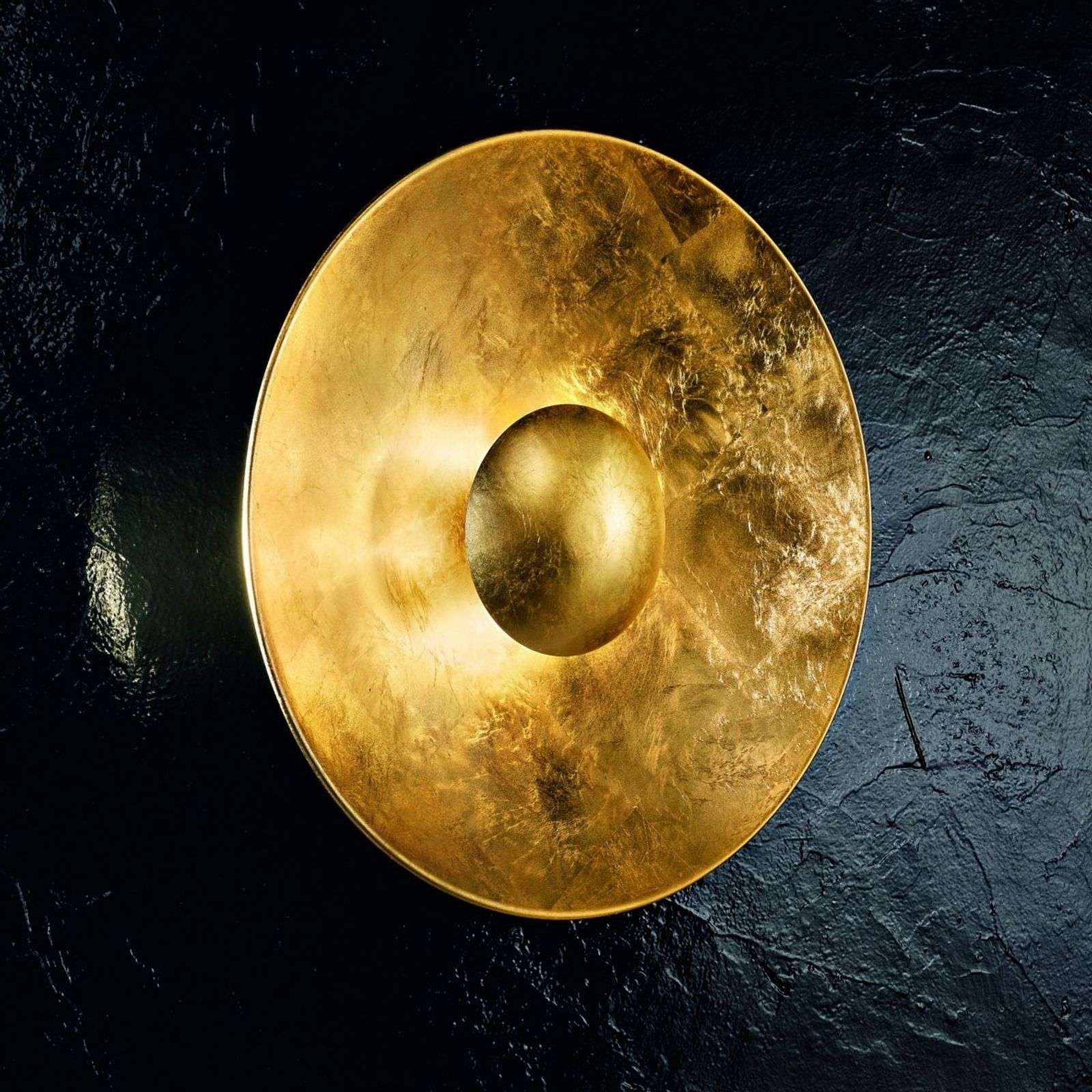 Tyylikäs Aura Sol -seinävalaisin – viimeistelty lehtikullalla Aura Sol -seinävalaisin loistaa seinällä kuin pieni aurinko ja tekee jokaisesta huoneesta kauniin katseenvangitsijan. Pyöreät metallilevyt on päällystetty lehtikullalla ja siten ne luovat lämpimän valonloisteen. Aura Sol – ylellinen seinävalaisin tunnelmalliseen valaisuun erityisellä loisteella. Valaisin voidaan asentaa myös kattovalaisimeksi. Energialuokka: A++