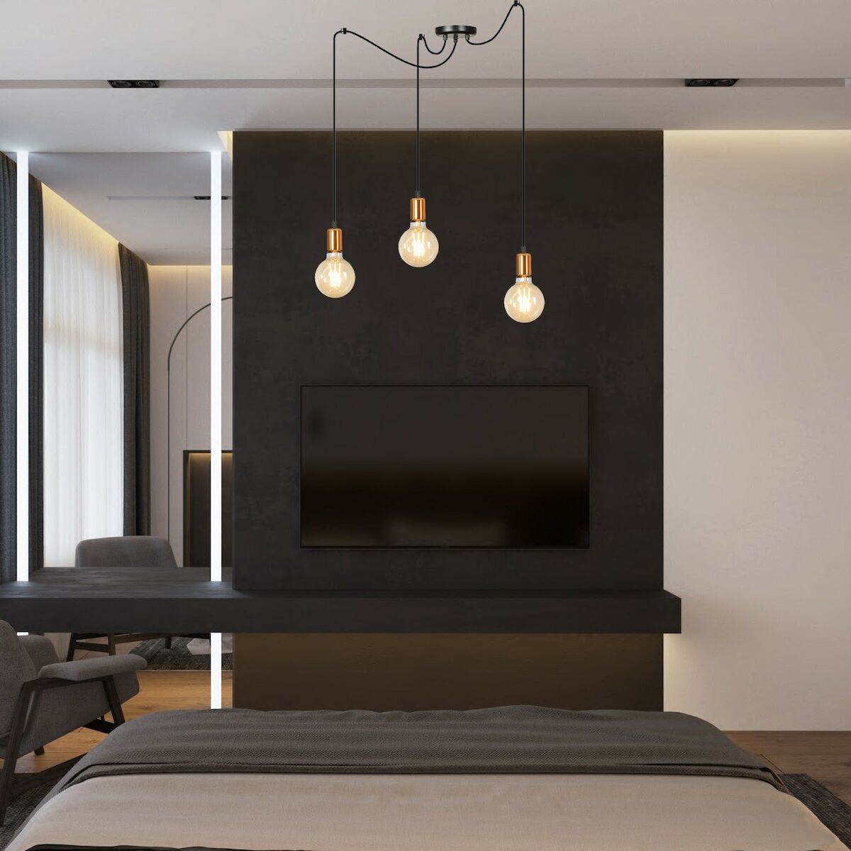 Moderni ja yksinkertainen Emibig Spark riippuvalaisin. Koostuu 3 riippuvasta, eri pituisesta johdosta, kiiltävät kuparin sävyiset osiot polttimoille. Johdon värivaihtoehtoina musta ja valkoinen, johdot ovat muovia. Paikka kolmelle E27 kokoiselle polttimolle, eivät sisälly hintaan. Johdot asetetaan kattoon mustien pikku kiinnikkeiden avulla. Pieni kiinnikin on auki kierrettävä jolloin kanta ruuvataan kattoon kiinni, johto väliin ja kansi kierretään paikoilleen jolloin johto jää kiinnikkeiden väliin. Ruuvit eivät kuulu valaisimen mukaan. Tutustu asennusoppaaseen ja varmista onnistunut lopputulos valaisimen asennuksessa.