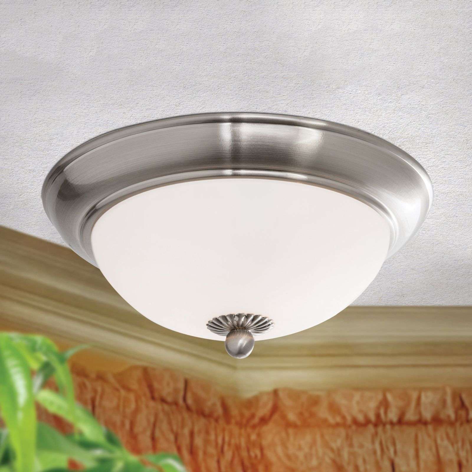 Klassinen kattovalaisin EMPIRE, puolipyöreä malli Kattovalaisin EMPIRE koostuu renkaan muotoisesta täysmessinkirungosta, jossa on satinoitu nikkelipinta. Siihen on kiinnitetty ilman kannattimia opaalilasista valmistettu puolipyöreä varjostin. Tyyliä on korostettu alaosan nupilla, jonka väritys on sama kuin rungossa. Kaksi 40 W lamppua saavat aikaan kirkkaan ja samalla lämpimän valaistuksen huoneeseen. Himmennin ei sisälly toimitukseen, mutta sen asentaminen on mahdollista. Korkealaatuista itävaltaista tuotantoa. Energialuokka: A++
