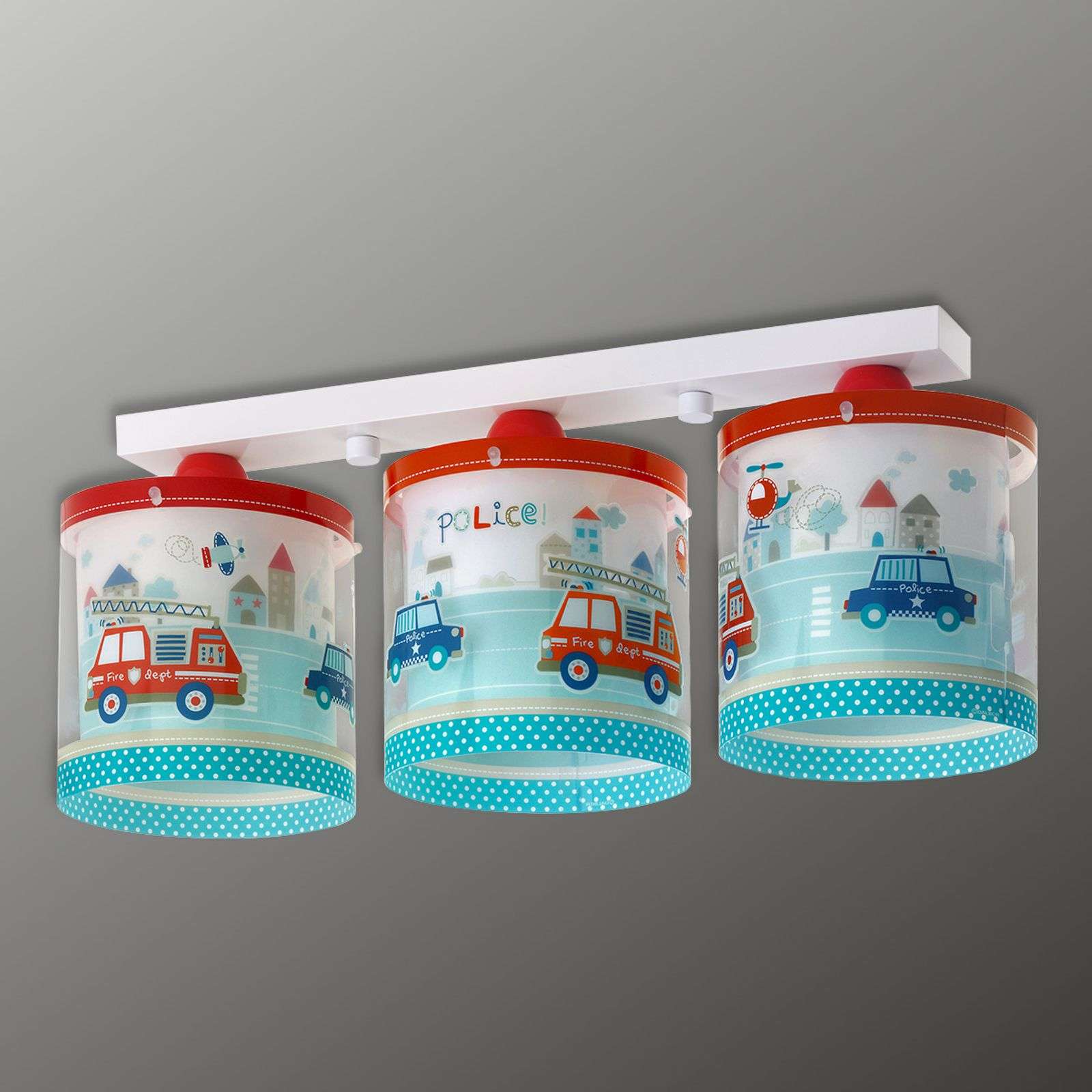 Värikäs lastenhuoneen kattovalaisin Police, 3 varjostinta Klassinen lastenhuoneen valaisin tekee varmasti vaikutuksen, joka ilahduttaa kaikkia lapsia. Poliisin lisäksi valaisimessa esiintyvät myös palokunta ja helikopterikin. Ja jos tässä ei vielä ole riittävästi, valaisin on myös fluoresoiva ja johdattaa lapset pehmeällä valollaan unten maille. Varjostinten yläosassa on punainen ja alaosassa puolestaan pilkullinen reunus. Energialuokka: A++