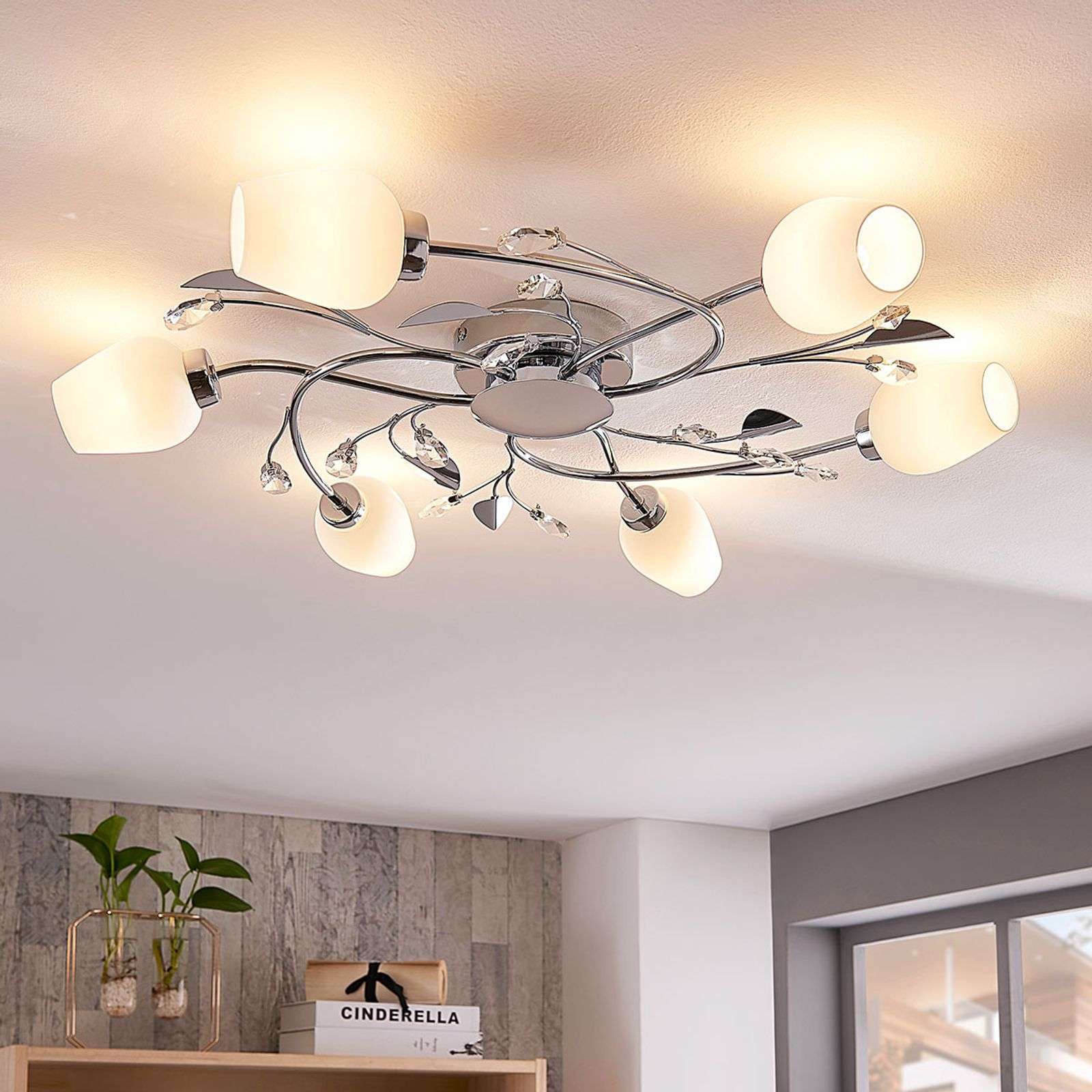 Pyöreä, kuusilamppuinen kattovalaisin Freda, jossa huurretut lasivarjostimet ja kauniisti koristeltu runko Freda on kattovalaisin, jonka kierteinen ja pyöreä runko on kiiltävää kromia ja koristeltu kauniisti. Lisäksi mallissa on kuusi huurretusta lasista valmistettua varjostinta, joihin sopivat G9-lamput ja jotka levittävät valoa tasaisesti ympäristöön, mikä saa aikaan varsin viihtyisän vaikutelman. Kierteet ja kiemurat muodostavat leikkisän ja dynaamisen ilmeen. Klassisen ja modernin kaunis yhdistelmä! Energialuokka: A++