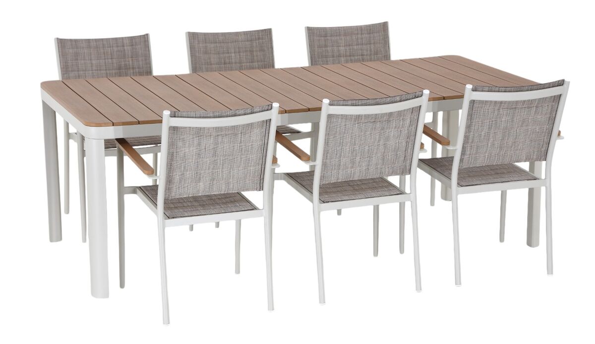Haave 6-hengen ruokailuryhmä on täydellinen valinta sinulle, joka arvostat ulkokalusteissa sekä käytännöllisyyttä että modernia tyyliä. Ruokailuryhmä koostuu tyylikkäästä ja kestävärakenteisesta ruokapöydästä sekä kuudesta käytännöllisestä tuolista, jotka yhdessä luovat miellyttävän ja pitkäikäisen kokonaisuuden ulkokäyttöön. Pöydän runko on valmistettu kevyestä, pulverimaalatusta alumiinista, joka kestää vaihtelevia sääolosuhteita ruostumatta. Kansi on helppohoitoista ja säänkestävää aintwoodia, joka jäljittelee kauniisti puun ilmettä ilman huoltotarvetta. Pyöristetyt kulmat tuovat pöytään turvallisuutta ja viimeisteltyä ilmettä ollen erinomainen valinta myös lapsiperheille. Pöydän ajaton muotoilu ja neutraalit s&aum…