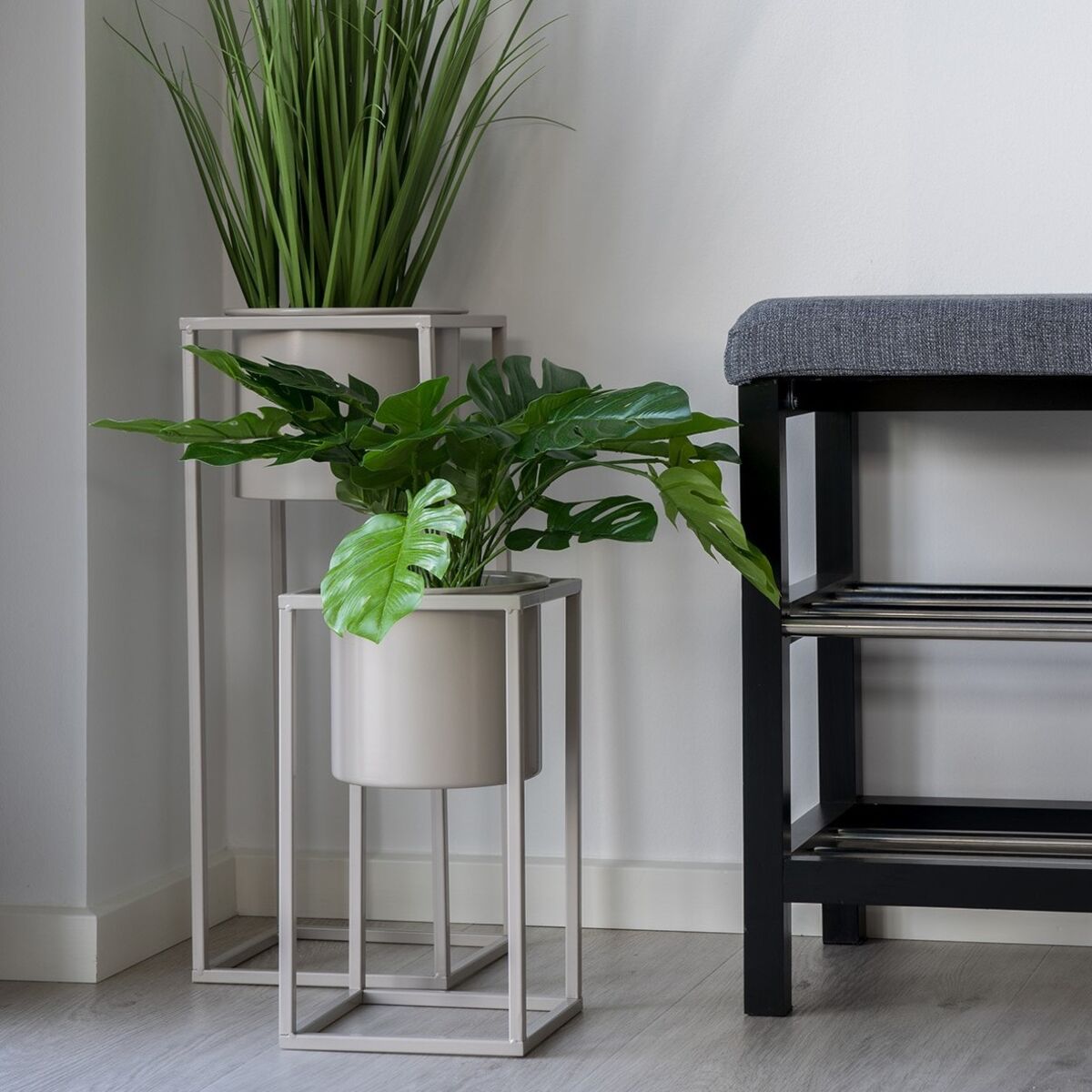Moderni House Nordic Marla kukkateline setti sisältää kuvassa näkyvät kaksi kukkatelinettä. Materiaalina maalattu teräs. Jalalliseen kukkalaatikkoon saat tyylikkäästi viherkasvit tai kukat esille. Sijoita oleskelutiloihin, eteiseen tai esimerkiksi lasitetulle terassille. Telineet tulee talvisin säilyttää sisätiloissa. Hintaan kuulu kaksi kukkalaatikkoa. Pienemmän mitat: Leveys 17 cm, syvyys 17 cm ja korkeus 31 cm. Pienemmän ruukun halkaisija 13 cm ja korkeus 15 cm. Isomman mitat: Leveys 19,5 cm, syvyys 19,5 cm, korkeus 50,5 cm. Isomman ruukun halkaisija on 14,5 cm ja korkeus 18 cm.