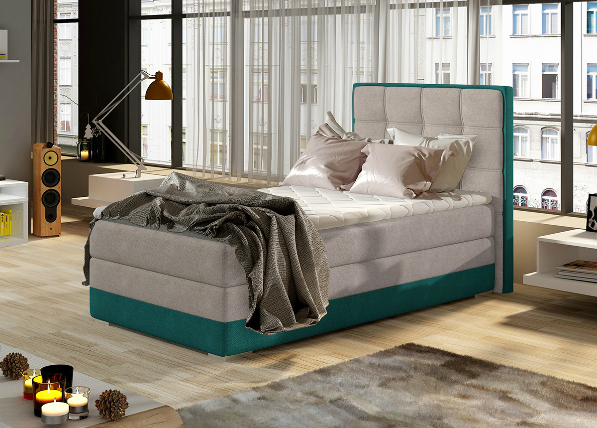 sänky koostuu vuodevaatelaatikosta, joustinpatjasta, petauspatjasta ja päädystä ; runko on valmistettu puusta ja kalustelevystä ; verhoiltu vihertävän sinisellä ja harmaalla kankaalla ; patja keskijäykkyydellä H3 (kehon paino 60-100 kg)