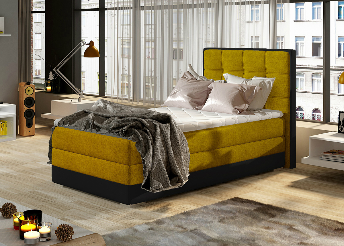 sänky koostuu vuodevaatelaatikosta, joustinpatjasta, petauspatjasta ja päädystä ; runko on puuta ja kalustelevyä ; verhoiltu keltaisella kankaalla ja mustalla keinonahalla ; patja keskijäykkyydellä H3 (kehon paino 60-100 kg)