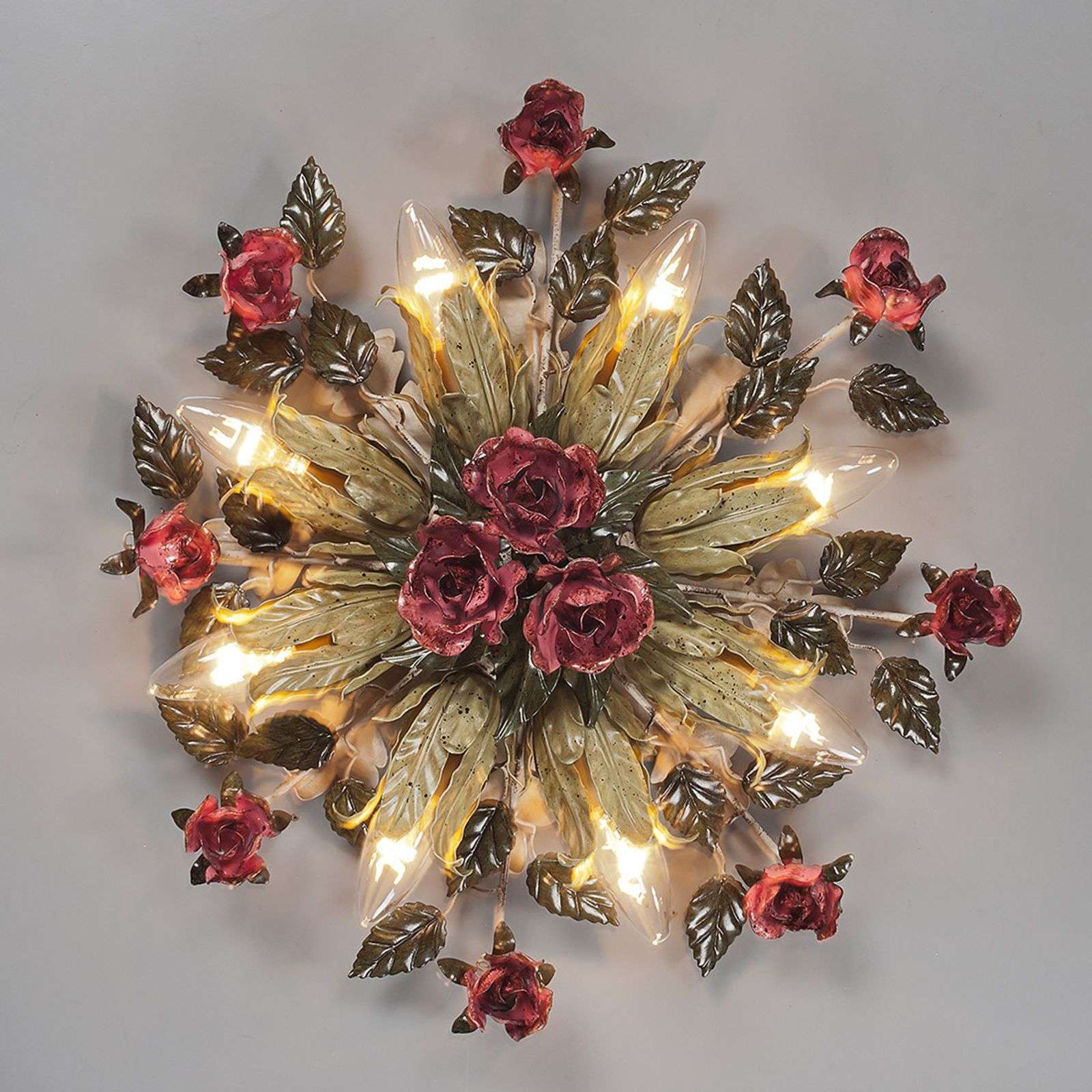 8-lamppuinen kattovalaisin Fiama firenzeläistyylissä Pitkävartiset ruusut, joissa on yksityiskohtaiset lehdet ja suuret aukeavat silmut, joissa lamput ovat, määrittelevät tämän erittäin leikkisän firenzeläistyylisen kattovalaisimen kuvan. Toskanalainen manufaktuuri, jonka työpajasta tämä esine tulee, ei ole säästellyt romanttisissa elementeissä, jotka eivät kuitenkaan koskaan näytä kitschiltä. Kuten suuri, laaja kukkakimppu, tämä aihe näyttää vaaleanvihreänä, vehreänä ja punaisena. Kahdeksan lamppua yhdessä ruusureliefin kanssa takaavat ainutlaatuisen valon ja varjon leikin. Energialuokka: A++