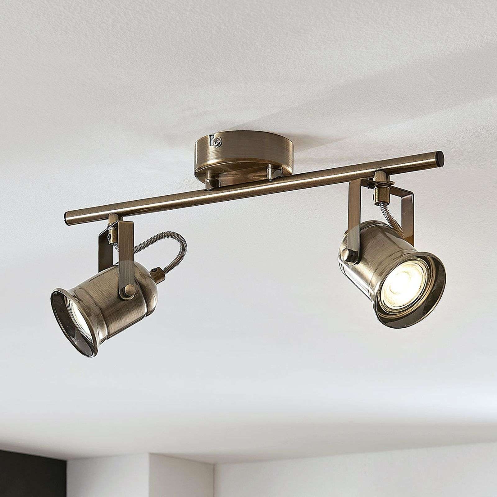Kaksilamppuinen kattovalaisin Anze teollisuustyyliin muotoiltuna Antiikkimessinkisen kattovalaisin Anzen ulkomuoto sopii erittäin hyvin moderneihin sisustuksiin, jotka ovat teollisuustyylisiä tai merihenkisiä. Valaisimessa on käännettävät ja taivutettavat kohdevalaisimet, joihin voidaan kiinnittää GU10-kantaiset lamput. Anze tuo hyvää valoa joka suuntaan ja siten upeaa valaistusta. Kattovalaisin Anze sopii eteisiin, olohuoneisiin tai ruokailutiloihin, joissa se tuo antiikista charmia ja modernia ilmettä. Energialuokka: A++