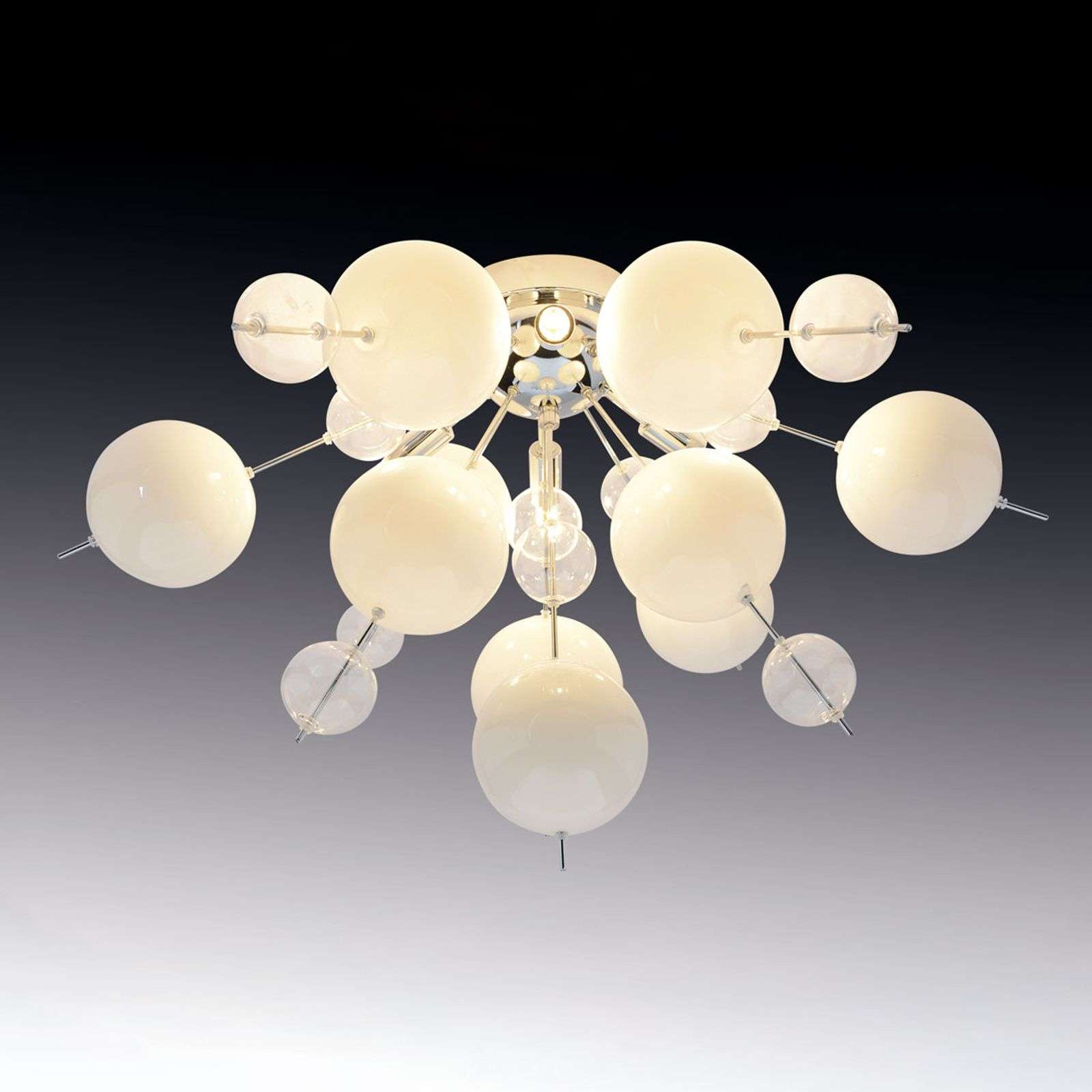 Silmiinpistävän upea kattolamppu Explosion Kattolamppu Explosion on todellinen katseenvangitsija erityisesti moderneihin olohuoneisiin ja ruokailutiloihin. Erikokoiset lasipallot on kiinnitetty metallitankoihin, jotka työntyvät keskiosan kannattimesta jokaiseen suuntaan alaspäin ja sivuille. Pallojen välissä on yhteensä kuusi kiinnitystä G9-lampuille, jotka tekevät Explosionista design-esineen ohella myös valaisimen. Energialuokka: A++