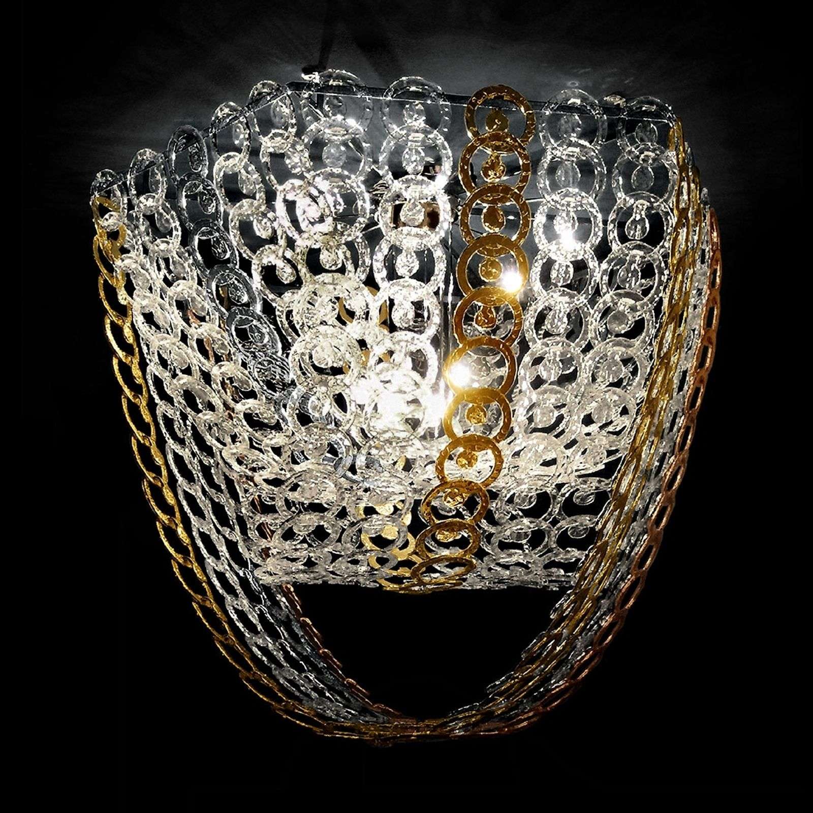 Tyylikäs kattovalaisin Circus – erivärisiä muranolasisia ketjuja Muranolasiset, rengasmaiset elementit on tässä klassisessa ja ylevältä vaikuttavassa kattovalaisimessa liitetty toisiinsa ketjuiksi, jotka osittain limittyvät toisiinsa. Kahdestatoista halogeenilampusta lähtevä valo joutuu ensin raivaamaan tiensä eriväristen (kirkas, hopea, kulta ja kupari) lasielementtien läpi – matkalla syntyy kauniita valoheijastuksia, jotka saavat aikaan säihkettä ja hukuttavat olohuoneen tyylikkääseen tunnelmaan. Kattovalaisin on sivupituudeltaan 155 cm ja siten todella vaikuttava ilmestys, joka ihannetapauksessa asennetaan suureen, avaraan tilaan, jossa se pääsee kokonaan oikeuksiinsa. Energialuokka: A++