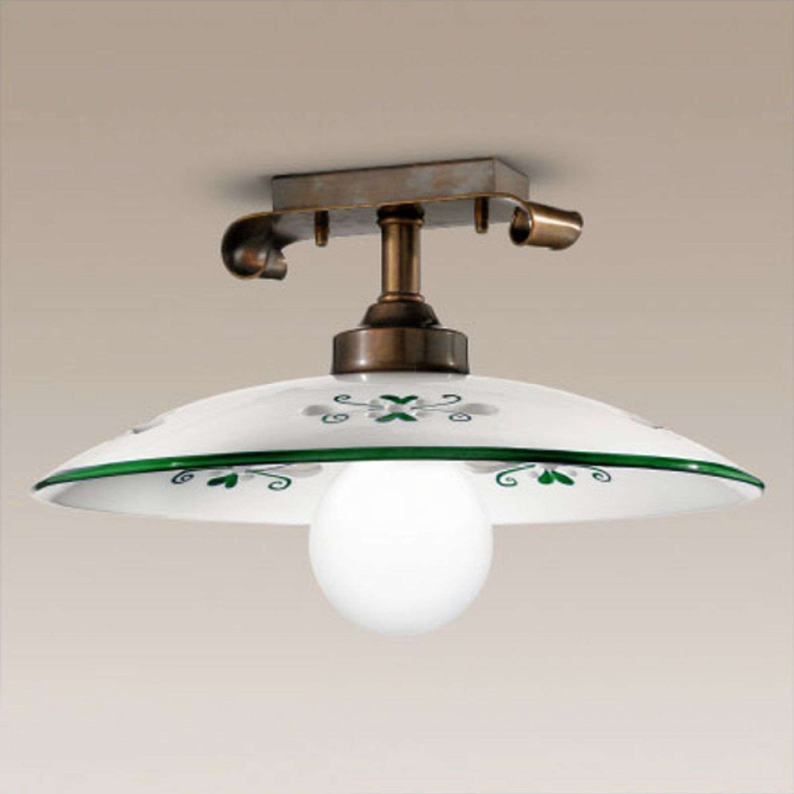 Kattovalaisin Bassano kauniin yksityiskohdin Hillitty Bassano-kattovalaisin tarjoaa tyylikästä valaistusta olohuoneeseen, ruokailutilaan tai sisäänkäyntialueelle. Bassano soveltuu käytettäväksi myös pienissä tiloissa, sillä vain 30 cm:n läpimitallaan se on vähäeleinen mutta silti charmikas katseenvangitsija. Keramiikkavarjostin on valkoinen, ja siinä on erilaisia ornamentteja sekä kapea, kontrastivärinen reunus. Sen saatavilla olevat värivaihtoehdot ovat ruskea, vihreä ja sininen. Bassano on kiinnitetty messinkiseen kattokiinnikkeeseen. Se takaa tyylikkään valaistuksen. Bassanon on luonut italialainen valmistaja. Sen tuotteet valmistetaan käsityönä, jotta jokaisessa valaisimessa on jotain erikoislaatuista. Venetsialaisessa valaisintaiteessa käytetään leikkisiä ja moderneja yksityiskohtia, jotka liittyvät italialaiseen perinteeseen. Energialuokka: A++