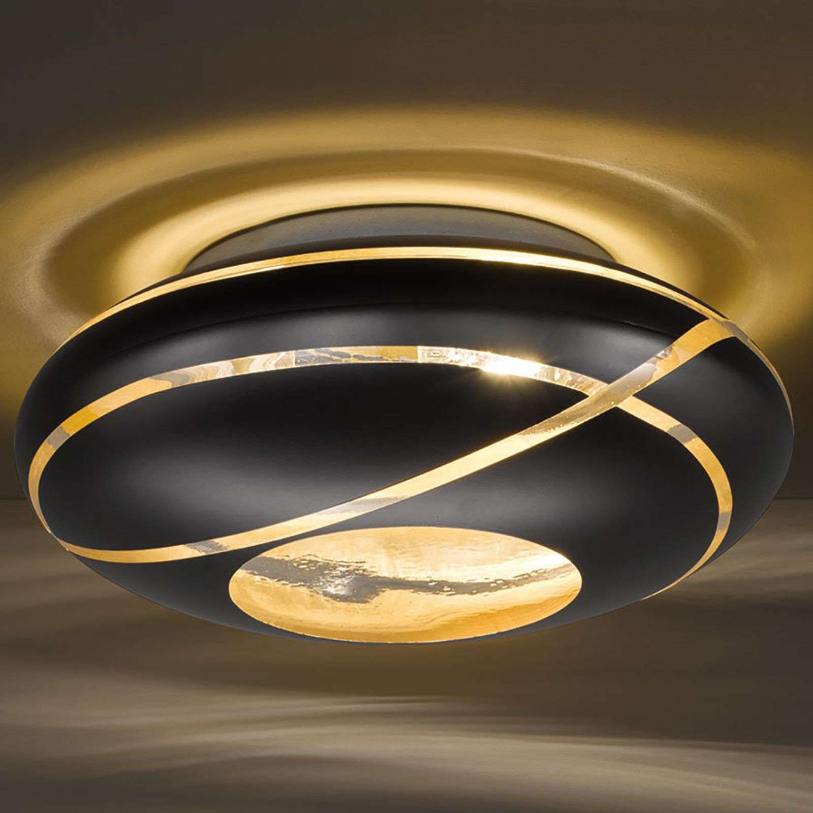Mustan ja kullan värinen kattovalaisin Farona arvokkaasta lasista – luksustunnelmaa ja käytännöllistä muotoilua Tässä epätavallisessa valaisimessa on onnistuttu yhdistämään toiminnallisuutta ja luksusta. Se tuo mihin tahansa huoneeseen omanlaisensa aksentin. Muotoilussa on käytetty selkeitä linjoja ja jaloa matan mustan ja kiiltävän kullan väriyhdistelmää. Leikkisät linjat muodostavat dynaamisen ilmeen, jossa voimakas suora linja tuo kontrastia rauhalliselle, kaarevalle koristeelle. Lasiselle kattolamppu Faronalle löytyy monia käyttömahdollisuuksia niin yksityiskodeista kuin toimistotiloistakin. Tätä kauniin muotoista valaisinta voidaan hyvin käyttää tyylikkäänä makuuhuoneen tai olohuoneen lamppuna sekä sisääntuloaulan, baarin tai muun vastaavan oleskelutilan vaikuttavana valaisimena. Farona-kattolamppu harmonisoi ennen kaikkea ajattomia tai moderneja sisustustyylejä, joissa on ripaus luksusta. Energialuokka: A++