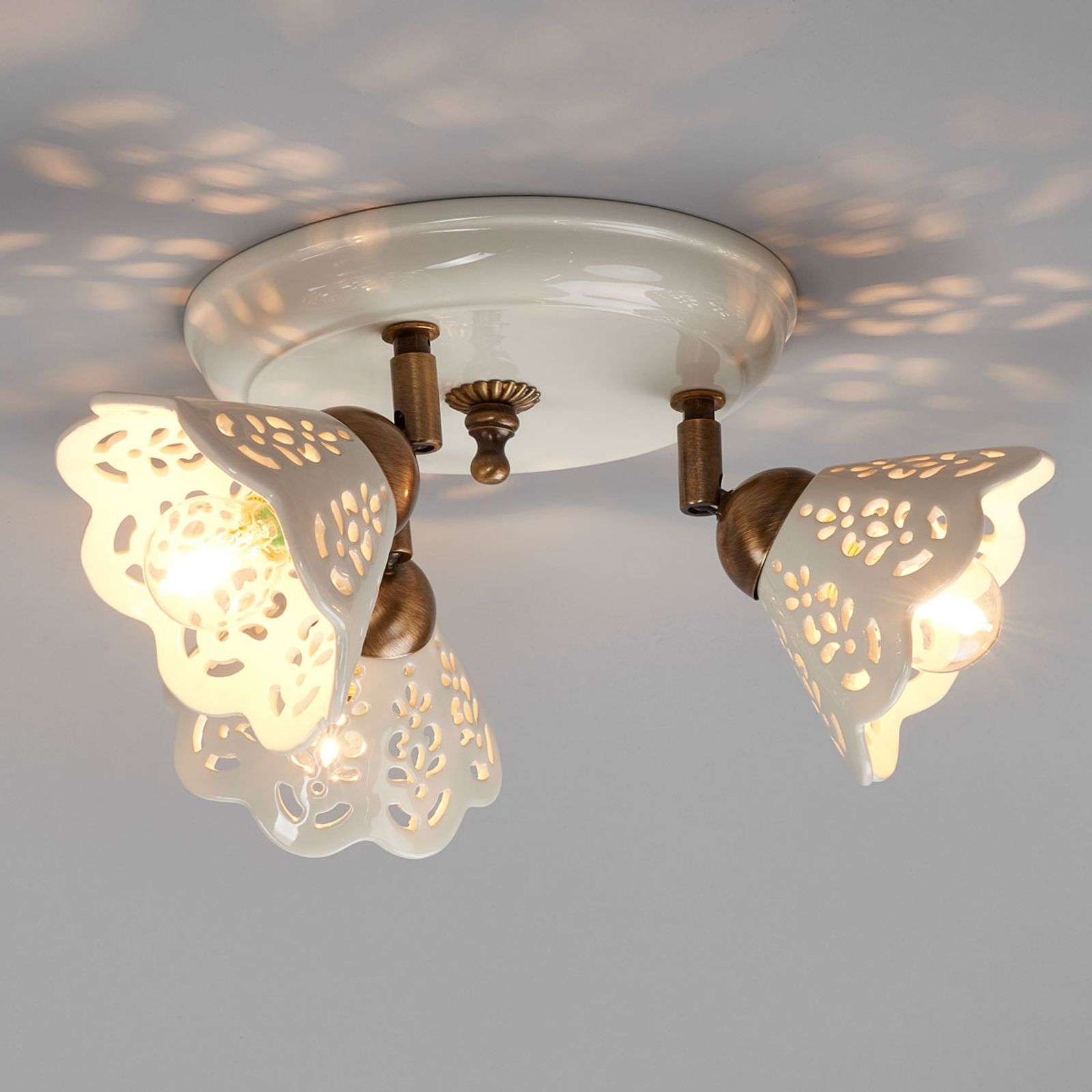 Lumoava design lumoavalle kattovalaisimelle – Portico 3-osainen PORTICO-kattovalaisin tekee vaikutuksen maalaisromanttisella tyylillään, joka on helppo integroida erilaisiin huoneisiin. Keraamiset, valkoiseksi lasitetut varjostimet tekevät valaisimesta uniikkikappaleen. Pitsikangasta muistuttava reikäkoristelu luo romanttista tunnelmaa. Äärimmäinen funktionaalisuus ergonomisen muotoilun ansiosta. Valaisin heijastaa valoa erittäin hyvin. Se levittää valoa alaspäin ja tekee aivan erityisen säväyksen. Myös metallikiinnikkeet täydentävät tyyliä ja antavat laadukkaan vaikutelman. Energialuokka: A++