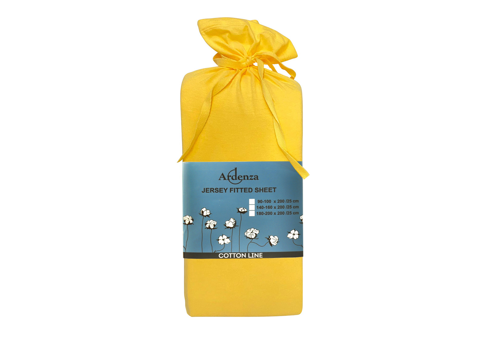 aluslakana kuminauhalla on pakattu lakanoiden säilytykseen sopivaan puuvillapussiin ; Materiaali: 100% puuvilla ; väri: keltainen ; tiheys: 140 g/m² ; sopii patjaan: 180-200×200 cm, paksuus 25 cm