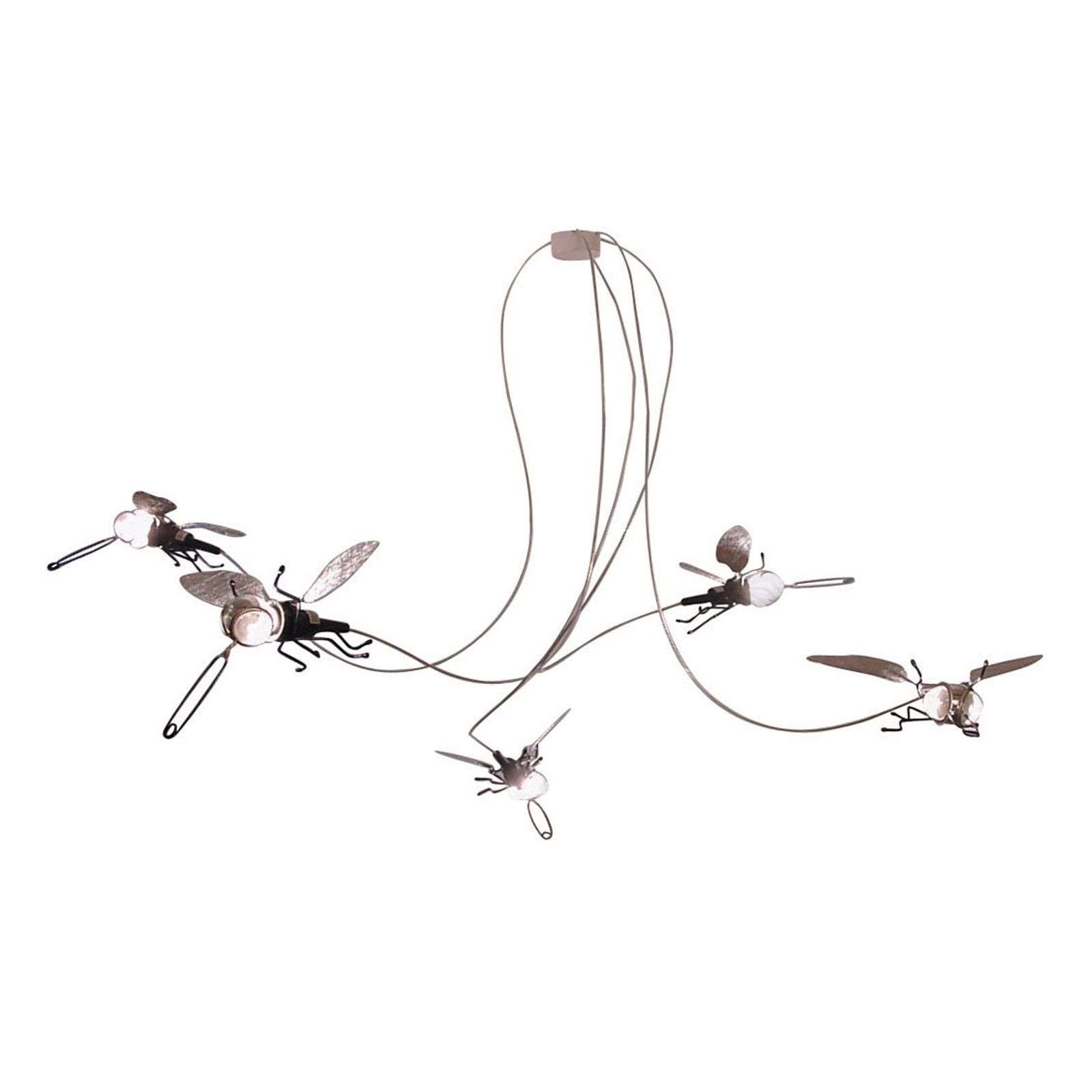 Originelli kattovalaisin Famille Filou kärpäsmuotoilulla, joka vakuuttaa todella erikoisilla yksityiskohdillaan ja jättää pysyvän vaikutelman Tässä kattovalaisimessa näkyy sen jokaisessa pienimmässäkin elementissä rakkaus yksityiskohtaan, jolla se on suunniteltu. Famille Filouta katsellessa saa vaikutelman viidestä huoneessa suhahtelevasta kärpäsestä, joka väkisinkin saa hymyilemään. Todella lumoava valaisin, joka mukaan lukien osittain peilaavan lampun avulla luo ainutlaatuisia valoefektejä ja antaa asuintilalle eksklusiivisen ilmapiirin. Erityisen mainitsemisen arvoisia ovat käännettävät ja kallistettavat teesiivilät, jotka toimivat kärpäshahmon silminä ja kärsänä ja ovat paras esimerkki nerokkaasta muotoilusta, jonka avulla tämä valaisin todella erottuu joukosta ja joka tekee siitä erehtymättömän koristekappaleen kaiken valaistukseen liittyvän keskellä. Ylittääkseen vielä omalaatuisuutensa: viittä Filouta kannattaa nailonlangat miniholkeissa. Jalat ovat koukussa parempaa “aerodynamiikkaa” varten. Muovikotelo on valkoinen ja virtajohto läpinäkyvä. Pituutta voi lyhentää yksilöllisesti. Energialuokka: A++