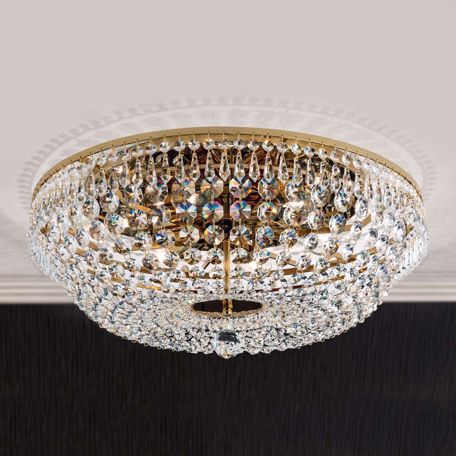 SHERATA – ylellinen kattovalaisin Schöler-kristalleilla, 24 karaatin kultaus Kun katsot valaisinta katossa, kaikki välkkyy ja kimaltelee! Vieri viereen sijoitetut, lukemattomat kristallit saavat katseet kääntymään kauneudellaan, joka on kuin suoraan sadusta. Tämä klassinen, korimallinen ja kristalleilla somistettu kattovalaisin sopii usean eri huoneen ensiluokkaiseksi valaisimeksi. Lamput on piilotettu kristallien taakse ja niiden valo säteilee upeasti hiottujen lasikivien läpi saaden aikaan lumoavan kauniit valoefektit! Nämä valaisimet keskittyvät laatuun, elegansseihin, laadukkaaseen viimeistelyyn ja kestävyyteen. Tässä suunnittelijoiden ja Itävallan käsityötaiteen luovuus yhdistetään maailmanlaajuisesti tunnustettuihin tuotteisiin. Valmistajan valaisimet on valmistettu vuodesta 1948 alkaen 100-prosenttisesti Itävallassa, mikä takaa myös varaosien pitkäaikaisen saatavuuden. Energialuokka: A++