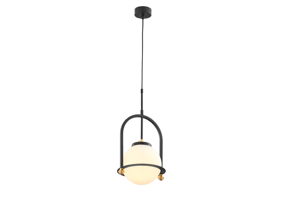 Moderni, metallinen riippuvalaisin lasikuvulla ; Valaisimeen sopii 1 x 60 W lamppu, kanta E27 ; viimeistely: musta, messinki satiini, valkoinen lasi ; Säädettävä ripustuskorkeus ; Lamppu ei sisälly toimitukseen