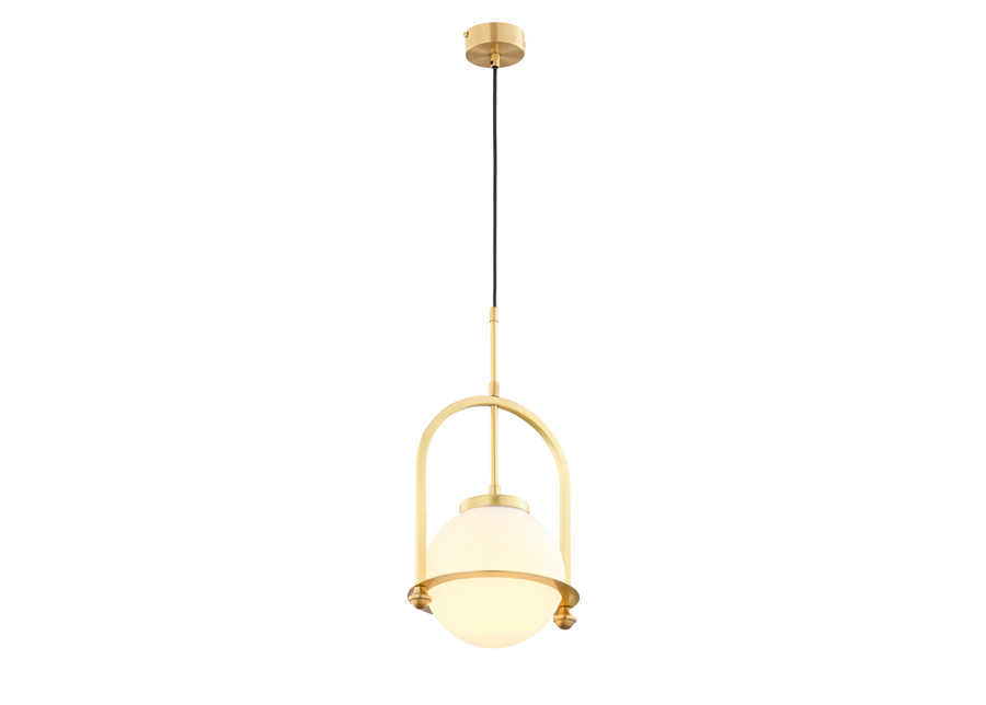 Moderni, metallinen riippuvalaisin lasikuvulla ; Valaisimeen sopii 1 x 60 W lamppu, kanta E27 ; viimeistely: messinki satiini, valkoinen lasi ; Säädettävä ripustuskorkeus ; Lamppu ei sisälly toimitukseen
