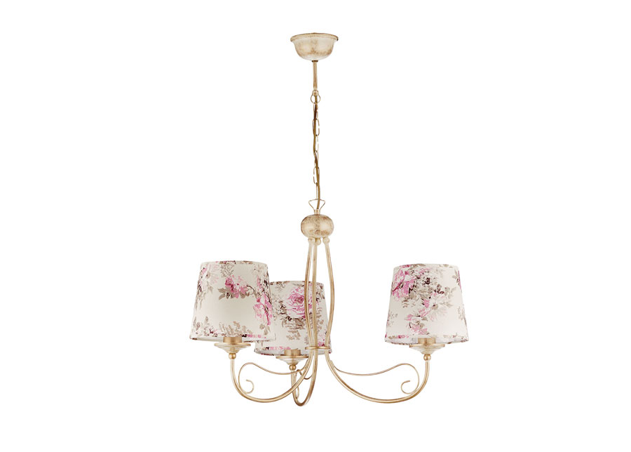 klassinen kattovalaisin ; teho enintään: 3×60 W, kanta E27 ; viimeistely: kulta + ecru (antiikki) ; Varjostimet on verhoiltu kukallisella kankaalla, perussävy ecru ; säädettävä ripustuskorkeus ; valonlähteet eivät sisälly toimitukseen