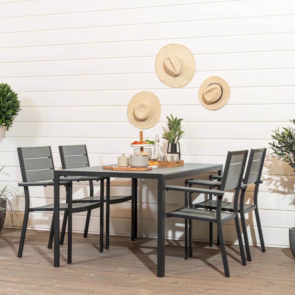 Laadukas ja huoltovapaa Saarni aintwood ruokailuryhmä neljälle hengelle. Pöydän ja tuolien rungot ovat alumiinia, joka ei ruostu. Pöydän kansi, tuolien istuin- ja selkäosa, sekä käsinojien päälliset ovat aintwood puukomposiittia, joka on huoltovapaa, helppohoitoinen ja säänkestävä. Aintwood on kovaa puristettua muovia (polystyrene), johon on tehty aidon puun kauneus. Tuolit ovat pinottavissa päällekkäin, joten ne eivät vie paljoa tilaa säilytyksessä. Tuolit toimitetaan valmiiksi kasattuina ja pöytä jalat irrallaan. Aintwoodin ominaisuuksiin kuuluu kestävyys yhdistettynä tyylikkääseen ulkonäköön. Aintwood kalusteita ei tarvitse periaatteessa hoitaa. Vinkkinä kuitenkin helppohoitoisuuteen, suosittelemme suihkuttamaan pintaan aintwood suoja-aineen. Tämän avulla saat pidettyä tuotteet helpommin puhtaana. Kalusteet voivat olla kesäkauden ulkona niin auringon paisteessa kuin vesisateessa. Huomioitavaa kuitenkin on, että UV-säteily voi haalistaa tuotteiden pintaa. Talveksi suosittelemme vi…