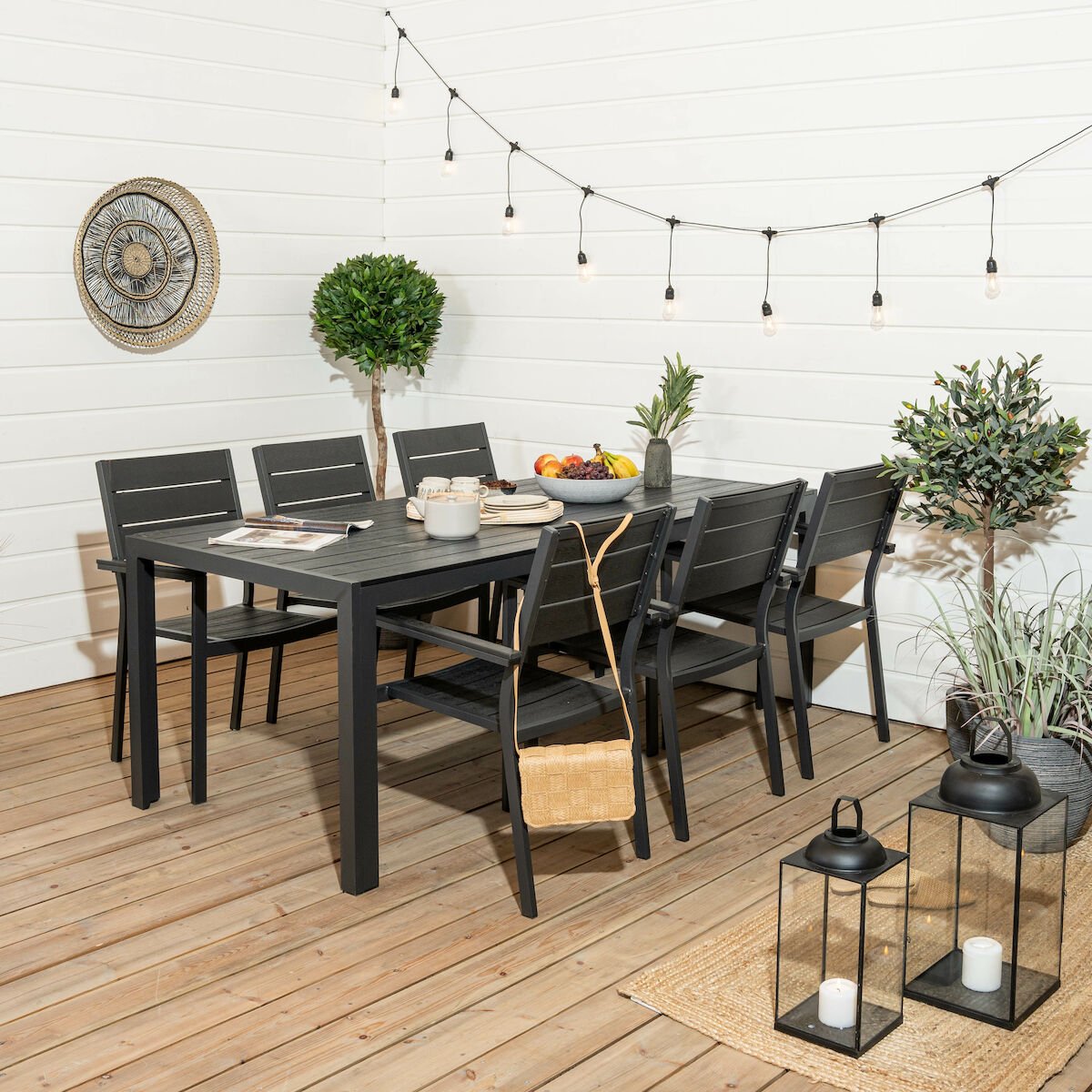 Laadukas ja huoltovapaa Saarni ruokailuryhmä kuudelle hengelle. Pöydän ja tuolien rungot ovat alumiinia, joka ei ruostu. Pöydän kansi, tuolien istuin- ja selkäosa, sekä käsinojien päälliset ovat aintwood puukomposiittia, joka on huoltovapaa, helppohoitoinen ja säänkestävä. Aintwood on kovaa puristettua muovia (polystyrene), johon on tehty aidon puun kauneus. Tuolit ovat pinottavissa päällekkäin, joten ne eivät vie paljoa tilaa säilytyksessä. Tuolit toimitetaan valmiiksi kasattuina ja pöytä jalat irrallaan. Aintwoodin ominaisuuksiin kuuluu kestävyys yhdistettynä tyylikkääseen ulkonäköön. Aintwood kalusteita ei tarvitse periaatteessa hoitaa. Vinkkinä kuitenkin helppohoitoisuuteen, suosittelemme suihkuttamaan pintaan aintwood suoja-aineen. Tämän avulla saat pidettyä tuotteet helpommin puhtaana. Kalusteet voivat olla kesäkauden ulkona niin auringon paisteessa kuin vesisateessa. Huomioitavaa kuitenkin on, että UV-säteily voi haalistaa tuotteiden pintaa. Talveksi suosittelemme viemään kal…