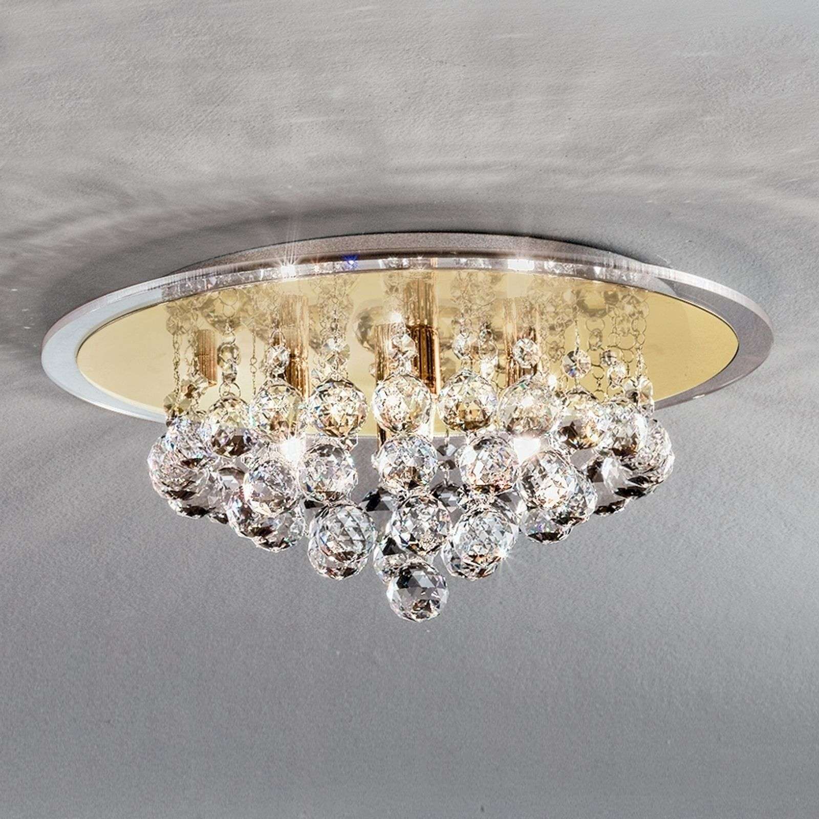 Vaikuttava kattovalaisin TUILA Tätä lamppua ei tarvitse kytkeä päälle, koska se tuottaa pelkällä läsnäolollaan ja runsaiden kristalliripustustensa ansiosta kauniita hetkiä. Kun pallomaiset kristallit rikkovat valoa, jonka halogeenikynät päästivät, ne tuottavat upeita heijastuksia, jotka lisäksi jalostuvat kullatun taustan ansiosta. Energialuokka: A++