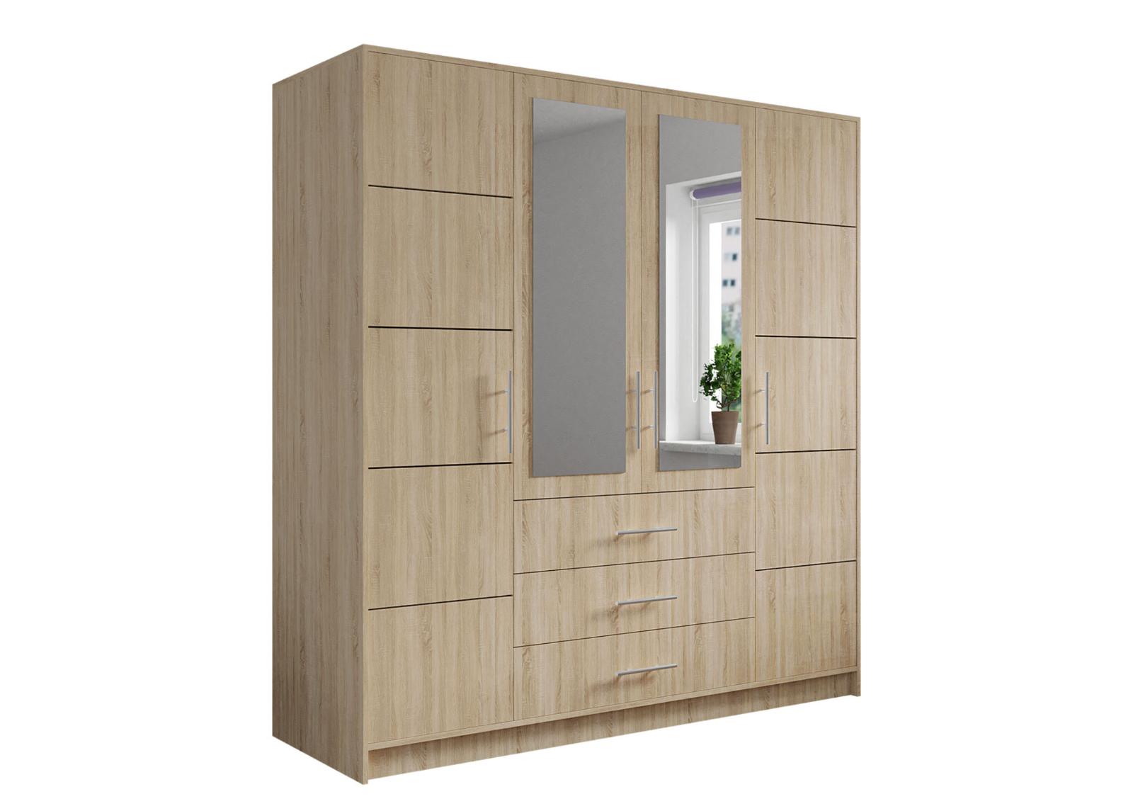 vaatekaappi on valmistettu laminoidusta kalustelevystä ; keskimmäisen peilioven takana on vaatetanko ; oikean- ja vasemmanpuoleisen oven takana on 4 hyllyä ; vetimet ovat muovia ; Laatikoissa on metallikiskot ; viimeistely: sonoma tammi