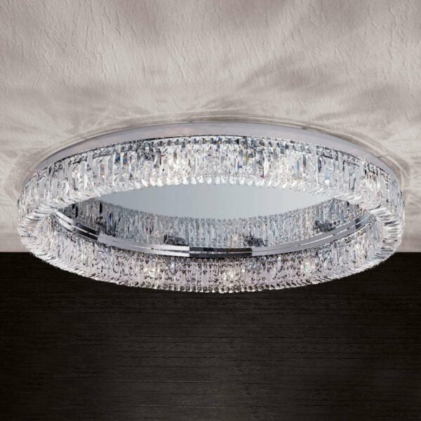 Kimaltava Ring-kristallikattovalaisin Ring-kattovalaisimessa riippuu joka puolella laadukkaita Schöler-kristalleja. Taidokkaasti hiotut kristallit on kiinnitetty kiiltäväksi kromattuun, täysmessingistä valmistettuun renkaaseen. Valonlähteet on sijoitettu taitavasti runsaslukuisten kristalliriipusten taakse, jotka alkavat säihkyä sisältä päin heti kun valo sytytetään. Yksittäiset kristalliketjut punotaan yhteen ja kiinnitetään kattoelementtiin vaativana käsityönä. Peilipintainen kattolaatta sekä heijastaa kristallien säihkeen että antaa tilalle syvyyttä. Ring on ihastuttava valaisin klassisen valaisinmuotoilun ystäville. Ylellisyys ja eksklusiivisuus ovat tämän Itävallassa valmistetun valaisimen kohdalla taattuja ominaisuuksia. Energialuokka: A++
